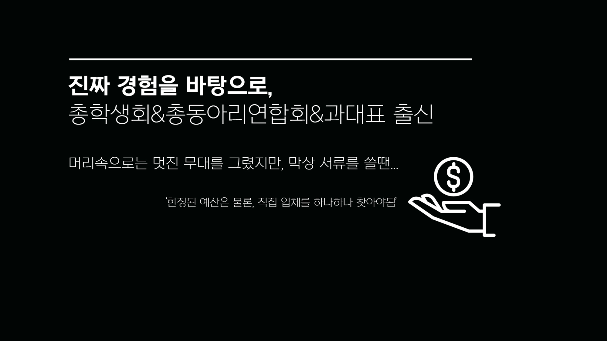 -대학 생활의 꽃인 축제, 대동제, 동아리 박람회 등 다양한 행사들은 학생자치기구에서 한정된 예산으로 기획 하여 진행하게 됩니다. 이러한 행사를 성곡적으로 진행하기 위해서는 행사장 세팅이 매우 중요합니다. 조명 LED 스피커 천막등 행사장 세팅에 가장 많은 예산이 투입되며, 행사의 품질을 결정짓는 중요한 요소로 작용합니다.