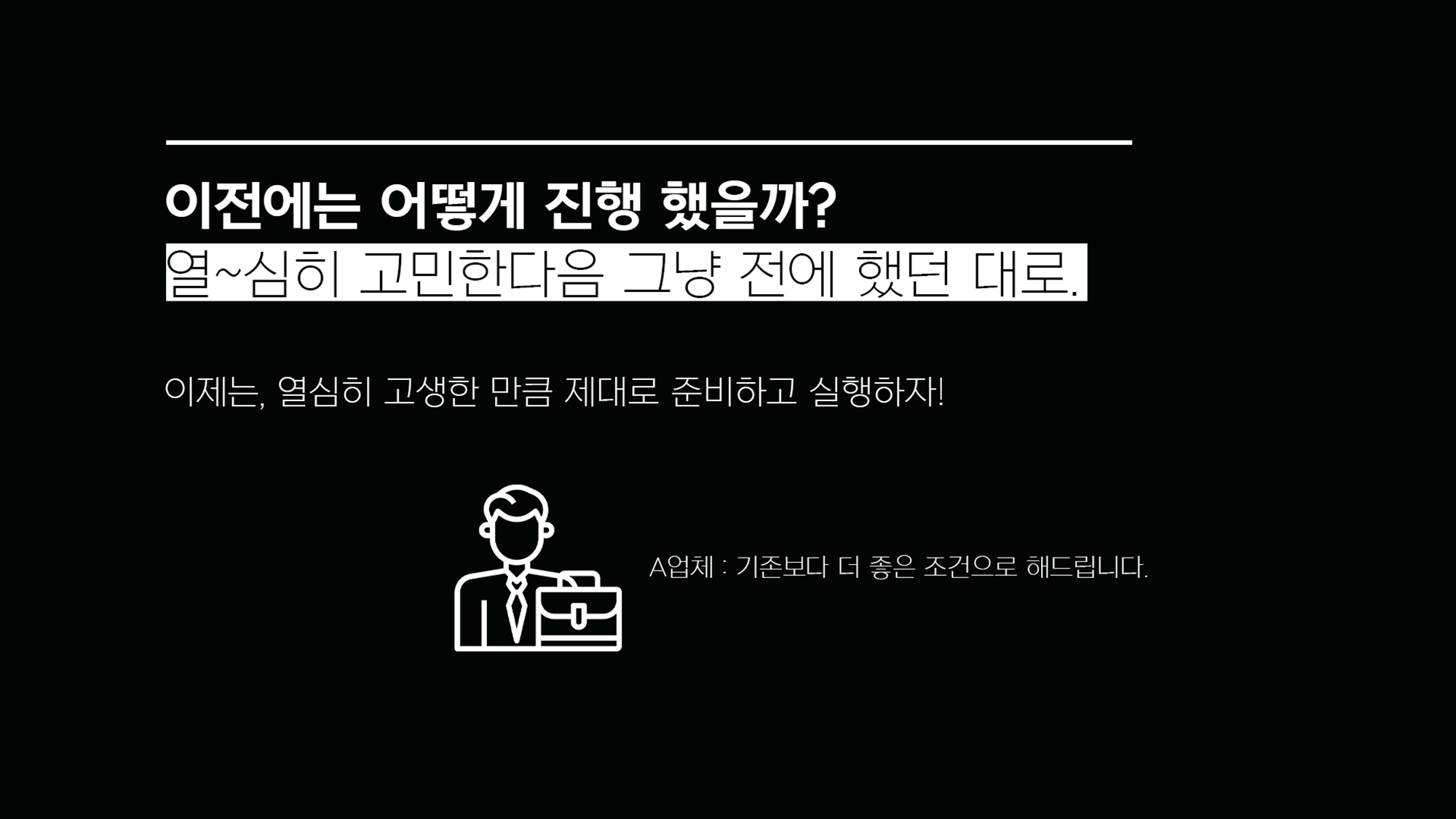 -대부분의 행사 기획 시, 이전부터 사용하던 업체를 다시 이용하는 경우가 많지만, 최근 한 업체에서 미팅 제안이 왔고 이러한 컨택을 통해 기존 업체보다 더 좋은 조건을 제시받고, 행사 기획까지 도움을 줄 수 있다는 사실을 알게 되었습니다.