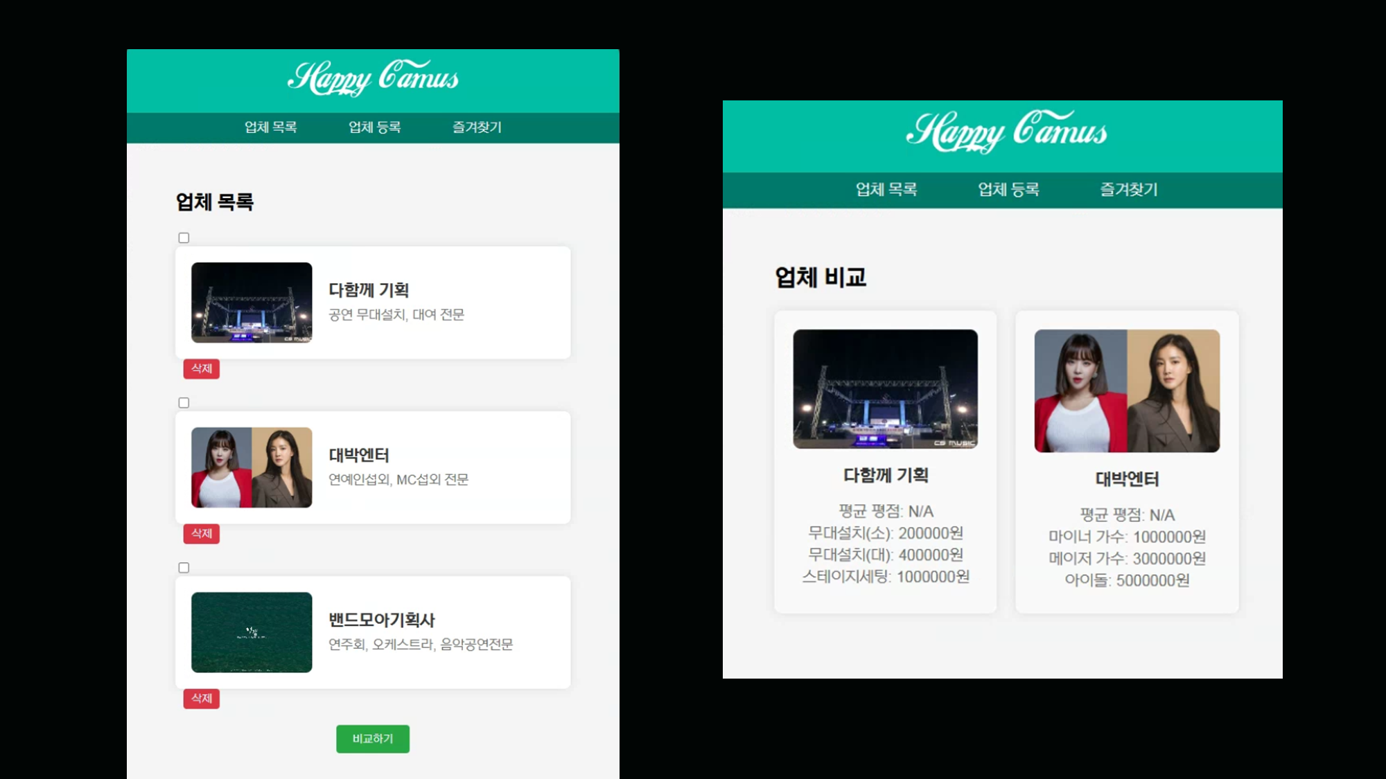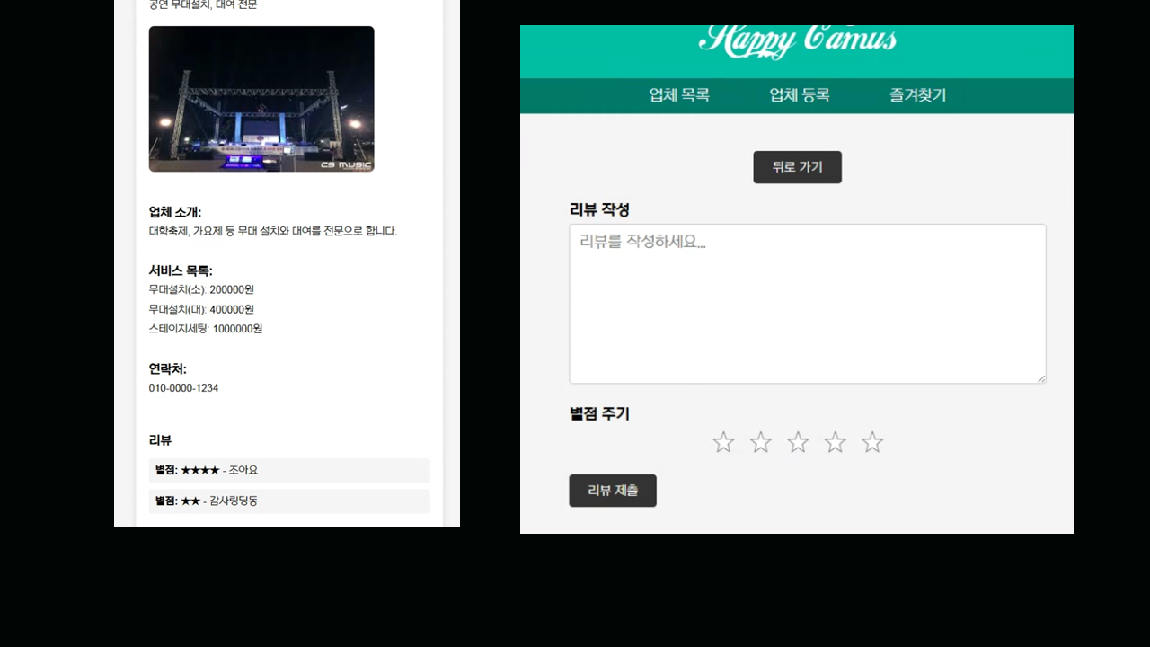 -실제 구현된 서비스 개요입니다. 저희 서비스는 아까 말씀드렸듯이 대학 축제, 동아리박람회, 대동제 등 다양한 행사를 기획하는 과정에서 필요한 행사 세팅 업체를 한 곳에서 쉽게 찾고 비교할 수 있는 플랫폼입니다.