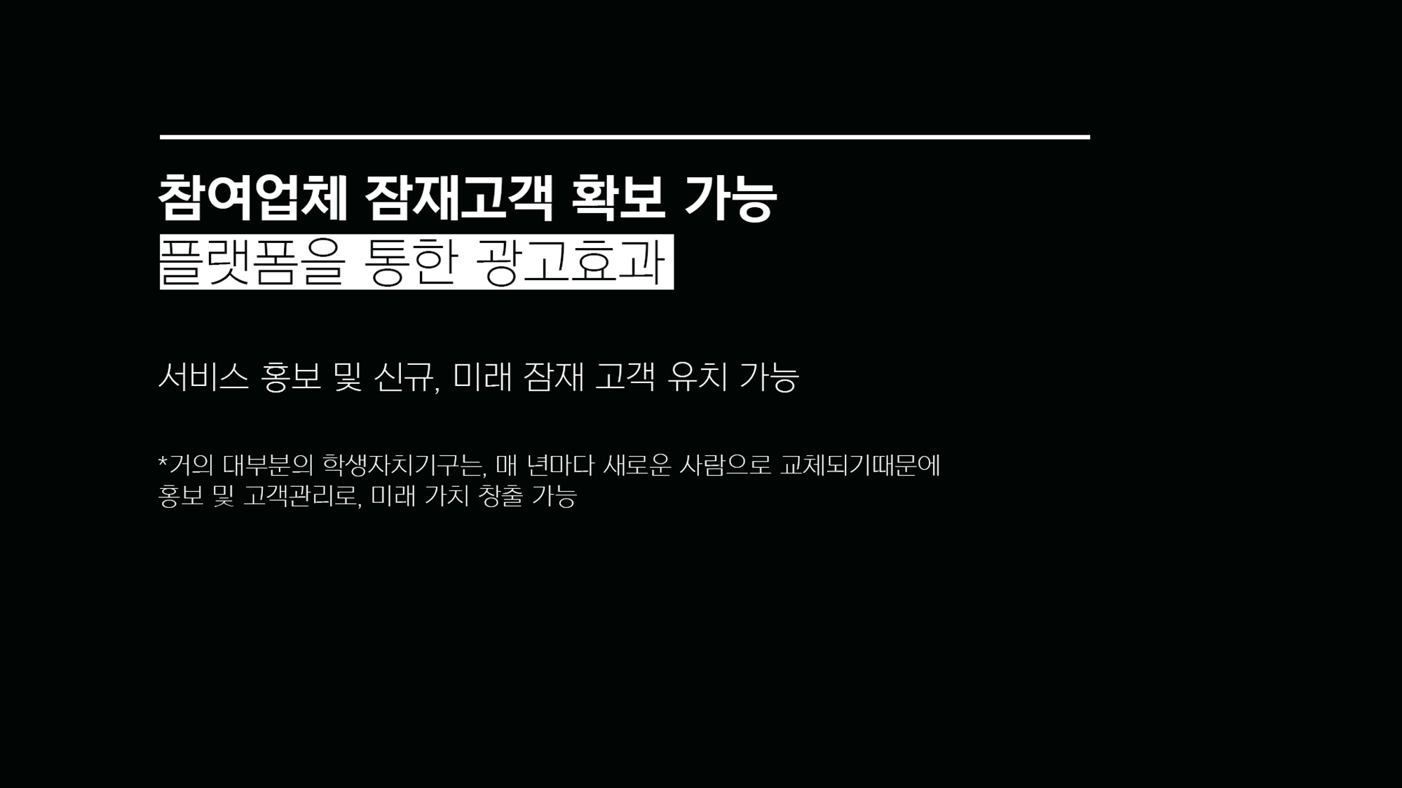 - 대부분의 학생자치기구는, 매 년마다 새로운 사람으로 교체됩니다. 매 년 마다 새로운 총학생회 임원, 새로운 총동아리연합회 임원으로 채워집니다. 따라서, 업체의 꾸준한 홍보 및 고객관리로 미래 가치를 창출할 수 있습니다