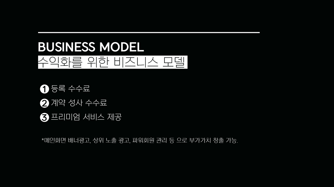 - 두번째로 계약 성사 수수료 입니다 플랫폼을 통해 성사된 계약의 일정 %를 수익으로 창출합니다. 이를 통해 지속 가능한 비즈니스 모델을 구축합니다.