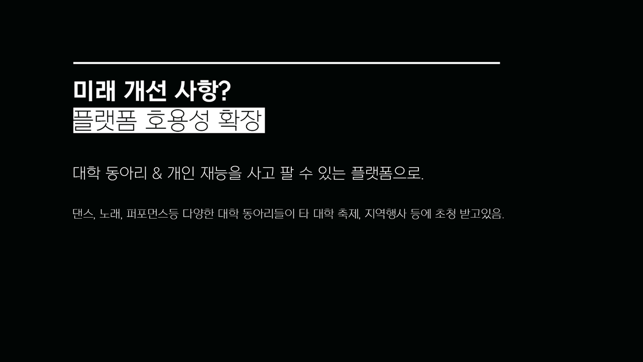 - 앞으로, 저희 서비스는 동아리나 개인에 재능을 사고팔수 있는 공간으로도 활용가능한 탭을 만들 계획입니다. 댄스동아리 밴드 동아리 같은 팀들이 행사에 초청받아 공연하는 경우가 종종있습니다. 각 동아리에서 각자의 단가를 책정하여 올려두면 행사 담당자가 어떤 학교에 어느 팀이 있는지 한눈에 보고 섭외할수 있는 공간으로도 발전시켜 학우들의 재능을 펼칠수 있는 무대도 마련하고싶습니다.