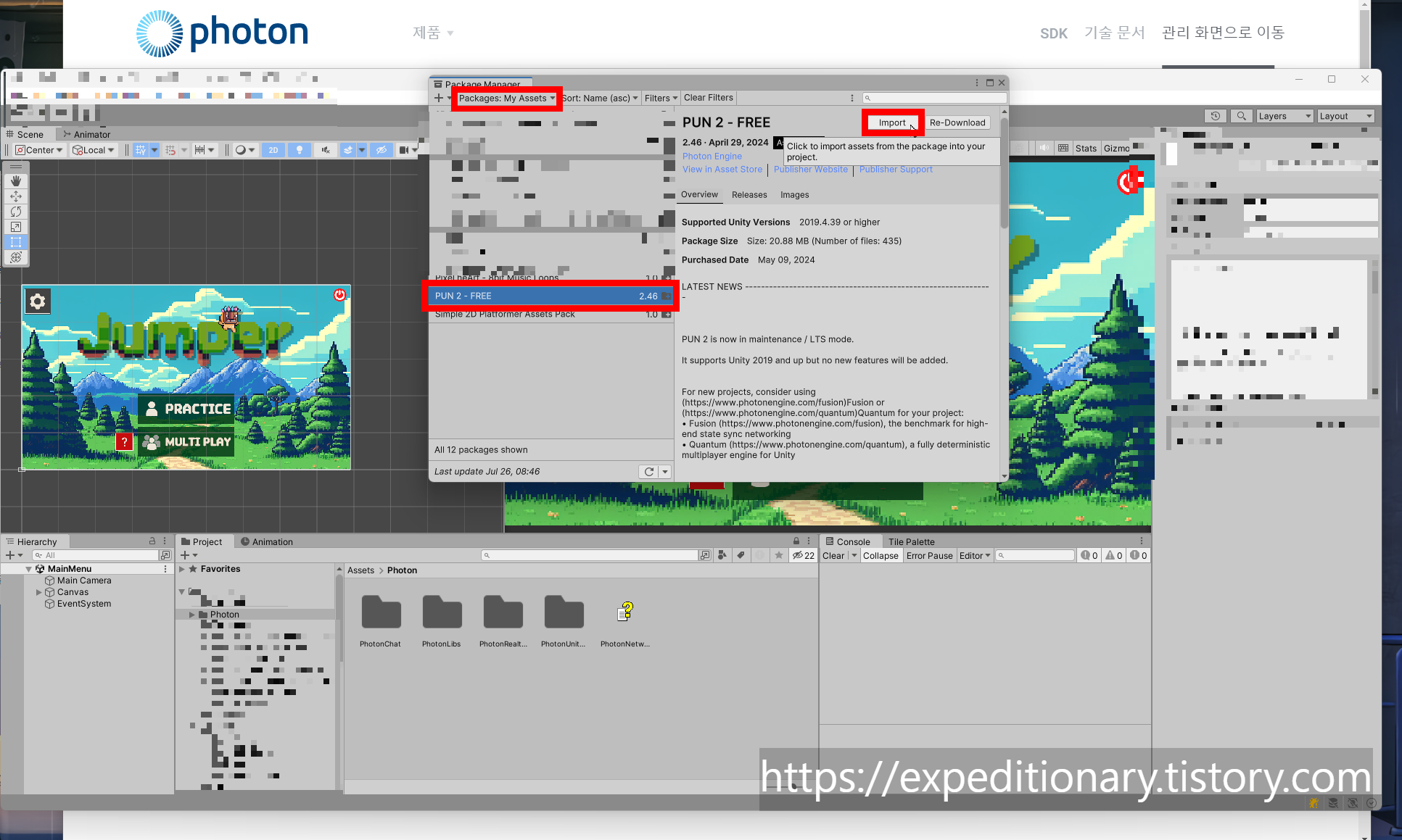 (8) My Assets부분 Asset Store에서 받아온 PUN2-FREE Import.