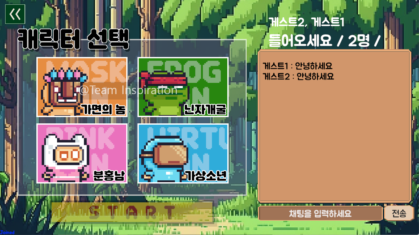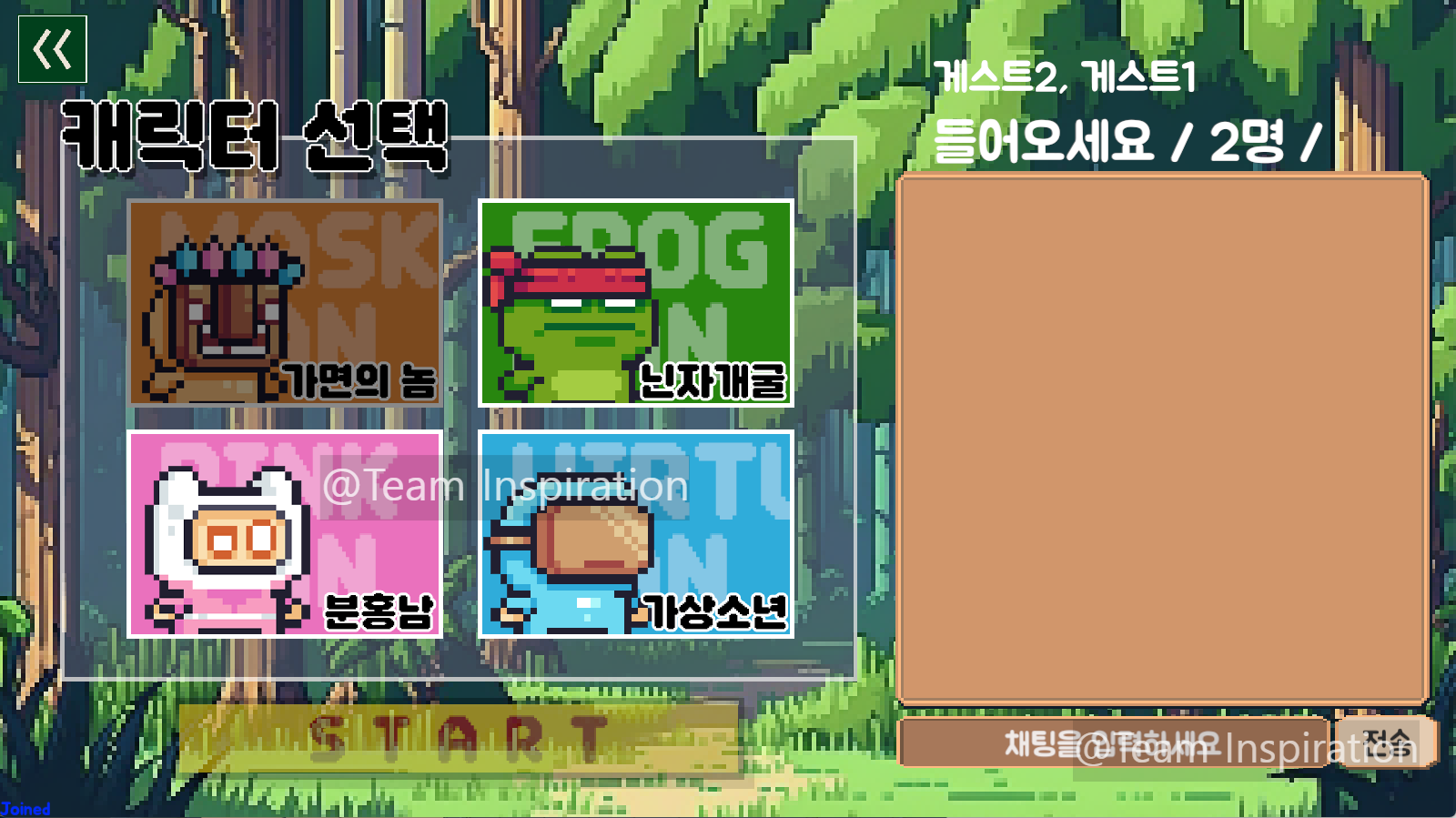 만들어진 게임 방에 입장하게 되면 캐릭터 선택버튼, 채팅, 방에 있는 인원수 확인이 가능. 게임 시작버튼은 방을 생성한 방장에게만 클릭버튼이 활성화되게 구현.