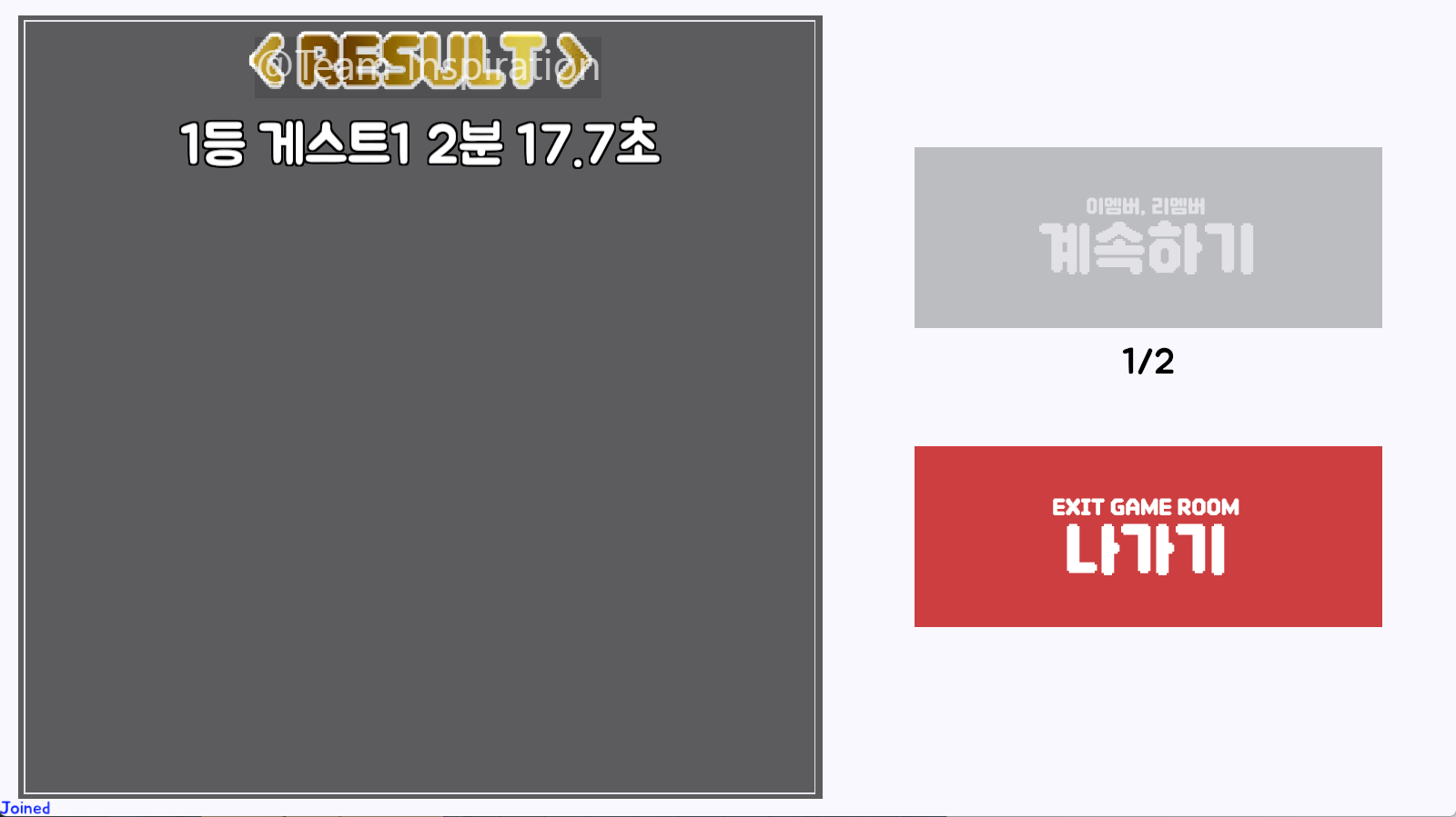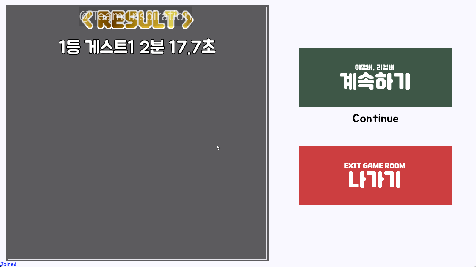 게임 종료화면에서는 플레이어의 도착시간 그리고 계속하기 버튼과 나가기 버튼이 존재.